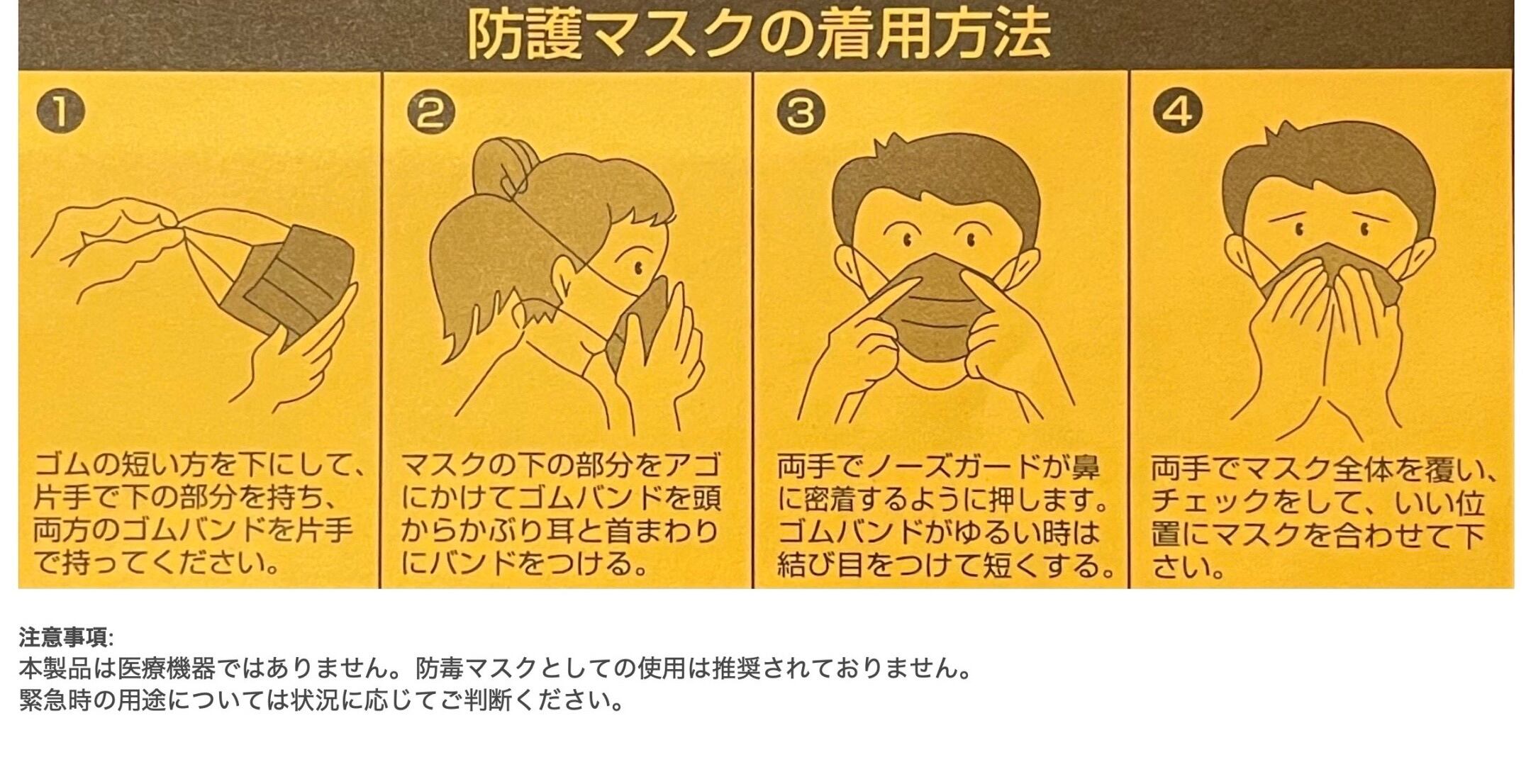 【商品詳細】 ●[サイズ] ワンサイズ(男女兼用) ●[材質] 耐熱性・難燃性素材 ●[製造国] 日本製 ●[使用方法] ①マスクを取り出し、②顎にフィットさせて装着、③両手でノーズガードを鼻に合わせ、④マスク全体が顔に密着していることを確認します。 【注意事項】 ●本製品は日常の予防用マスクとしても使用できます。 ●使用中に異常を感じた場合は、ただちに使用を中止してください。使用する際は、パッケージに記載された装着方法をよく確認のうえ、ご利用ください。 ●本製品は医療用ではありません。 ●返品・交換は未開封、未使用のものに限らせて頂きます。 防護マスク」は、火災や緊急時における煙や有害物質からの保護を目的としたマスクです。消防庁認定番号 E-21-15744 を取得しており、災害対策としていつでも携帯できるように設計されています。コンパクトで軽量なため、バッグやポケットに入れて日常的に持ち歩くことができ、いざという時に取り出しやすい設計です。